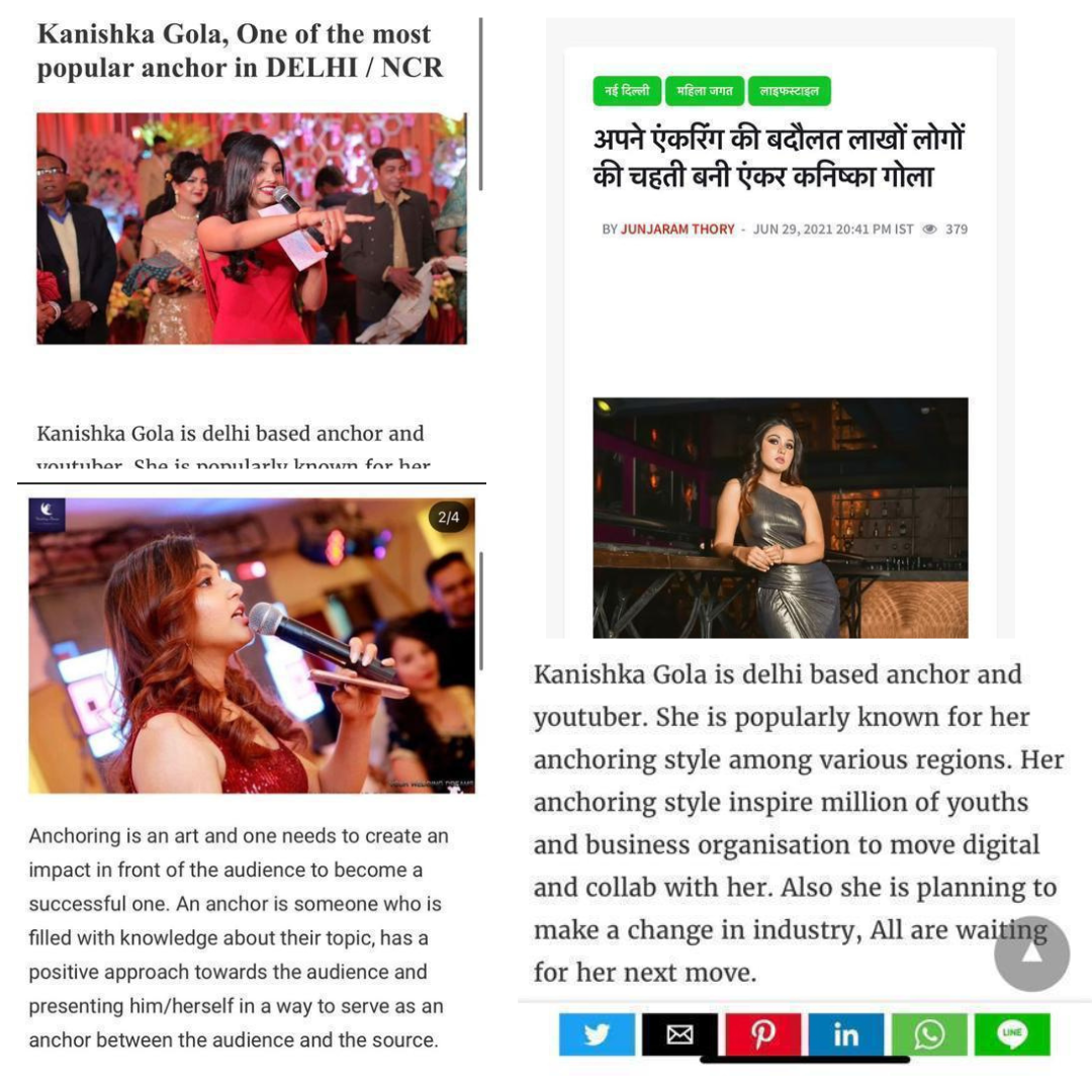 Kanishka Gola: A dynamic emcee, host, and public speaking trainer & Josh talk speaker with 9+ years in the industry. 3000+ events including corporate and social gatherings. Expertise in teaching anchoring tips. Former public speaking trainer at GD Goenka, empowering 1000+ students nationwide and internationally. Mastery in English and Hindi.